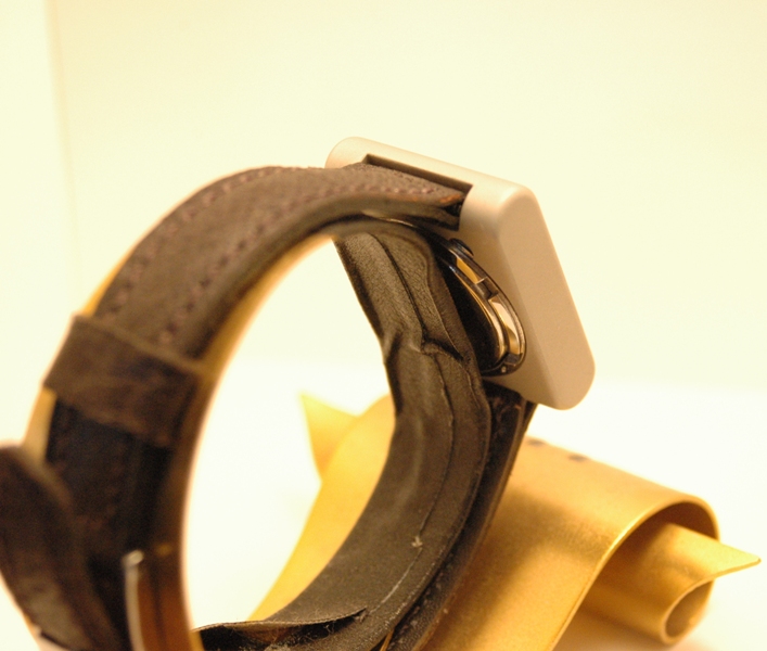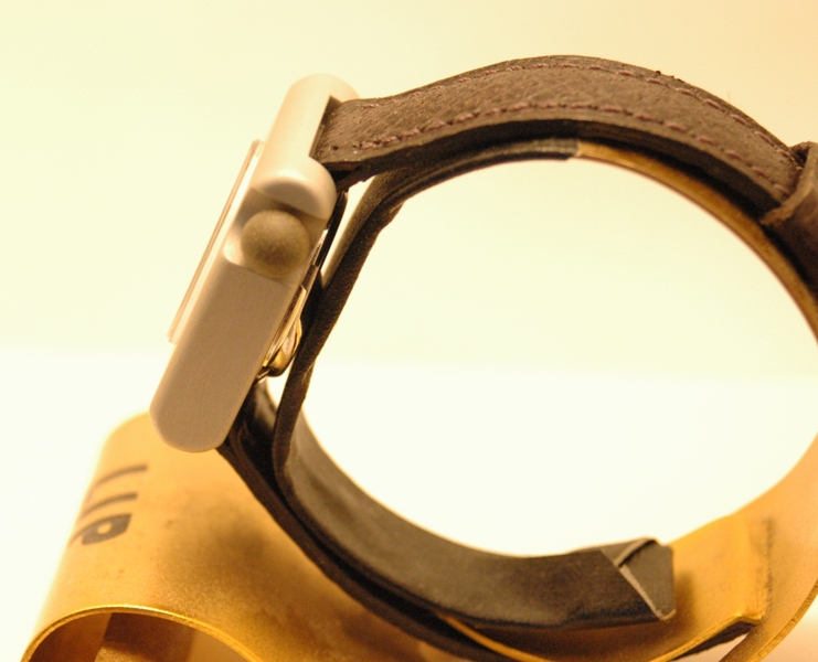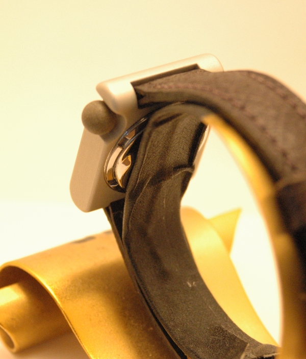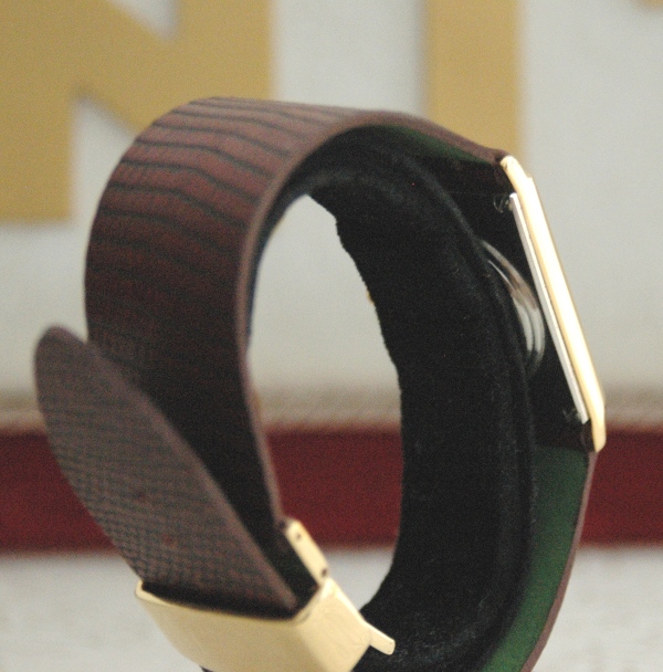 Elle est dotée d'un bracelet sur mesure en lézard cognac, réalisé par Les Bracelets de Sophonie.