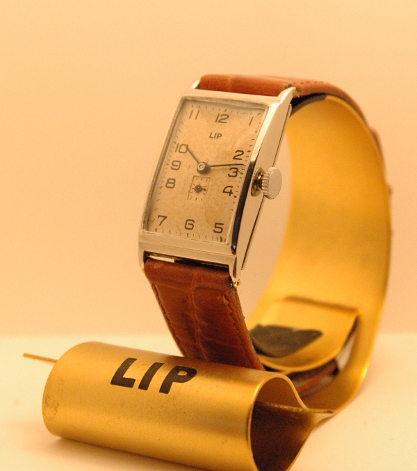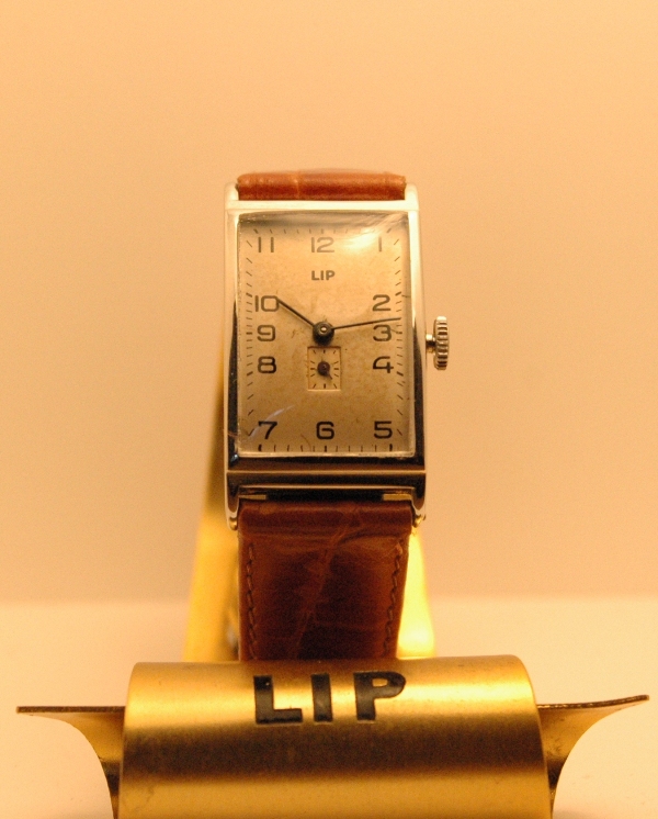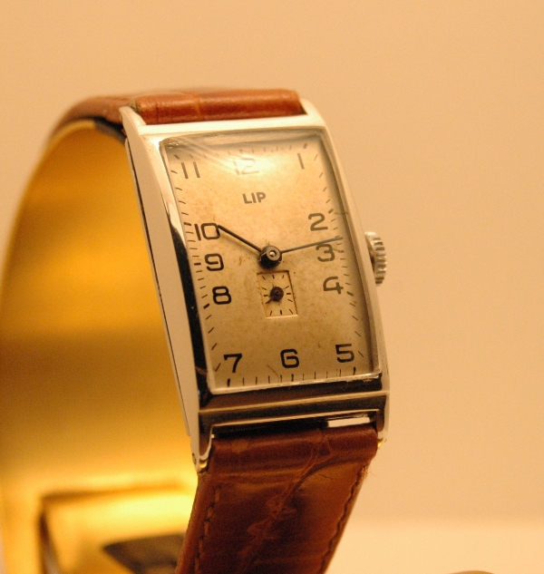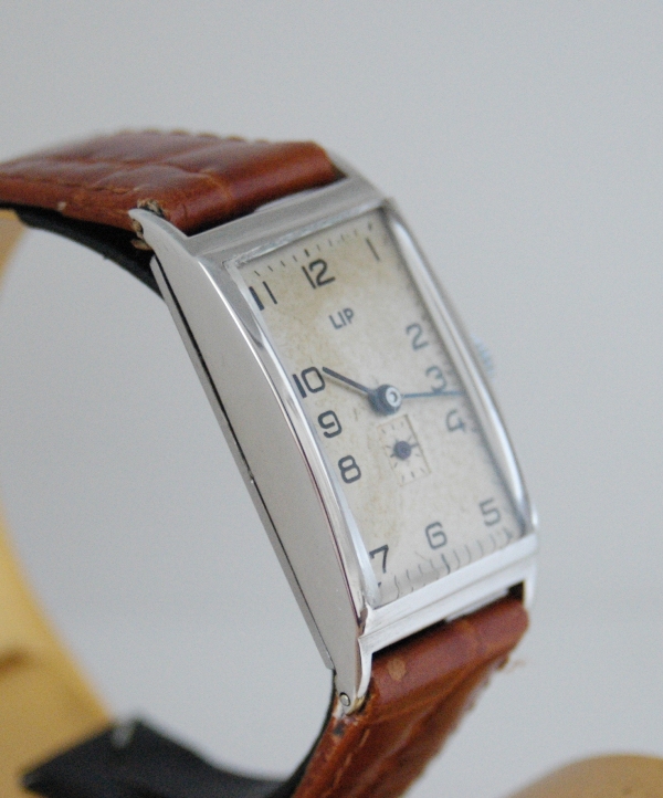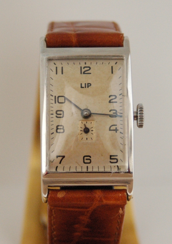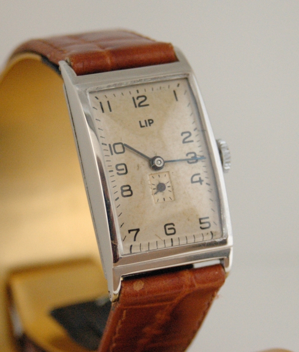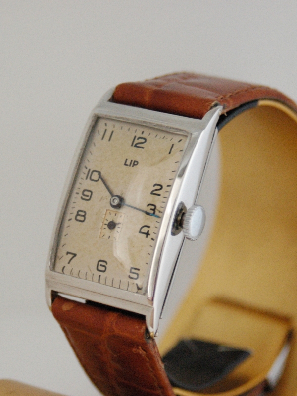 Voici un bel exemplaire de Lip classique. Sa forme rectangulaire en fait une montre très classe, d'une rare élégance avec son cadran patiné.