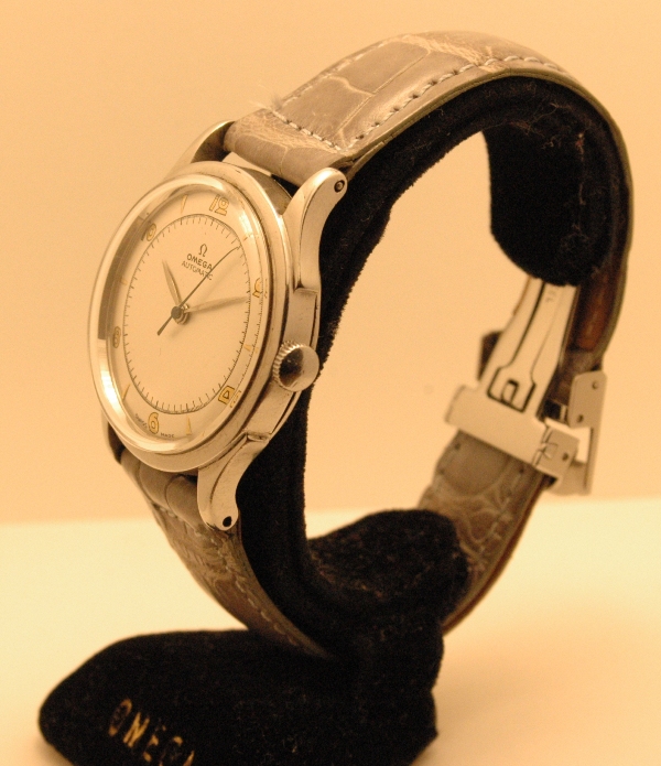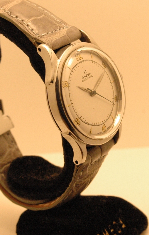 Omega des années 40, son boitier acier à anses lyre est typique de cette époque. Elle est pourvue du calibre à Bumper Omega 332, dans un état quasi neuf.