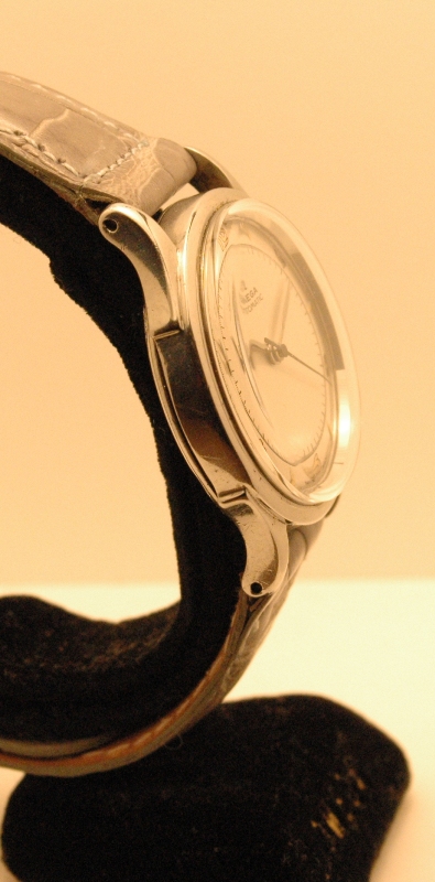 Voici un superbe exemplaire de montre suisse d'avant garde, avec son indication de la réserve de marche qui précise à son porteur l'autonomie du mouvement. Equipée du calibre Jaeger-LeCoultre 481, cette montre a été entièrement restaurée par mes soins (cf. page dédiée).