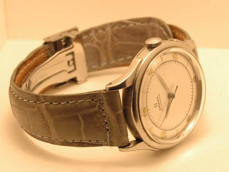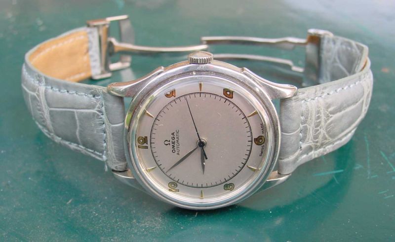 Une autre Omega, cette fois des années 50 et signée Seamaster, à petite seconde mais mouvement automatique à rotor (calibre Omega 491). Son cadran a une patine magnifique :
