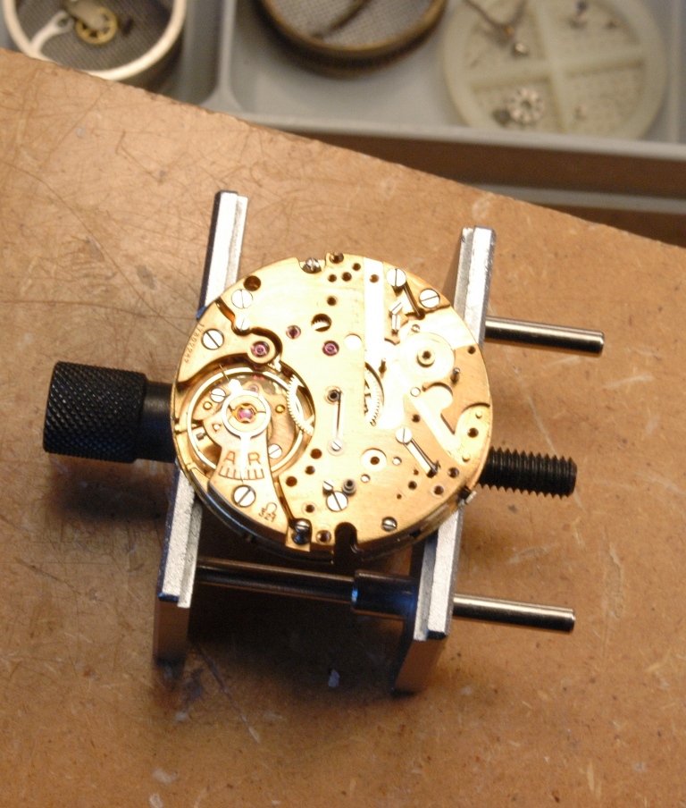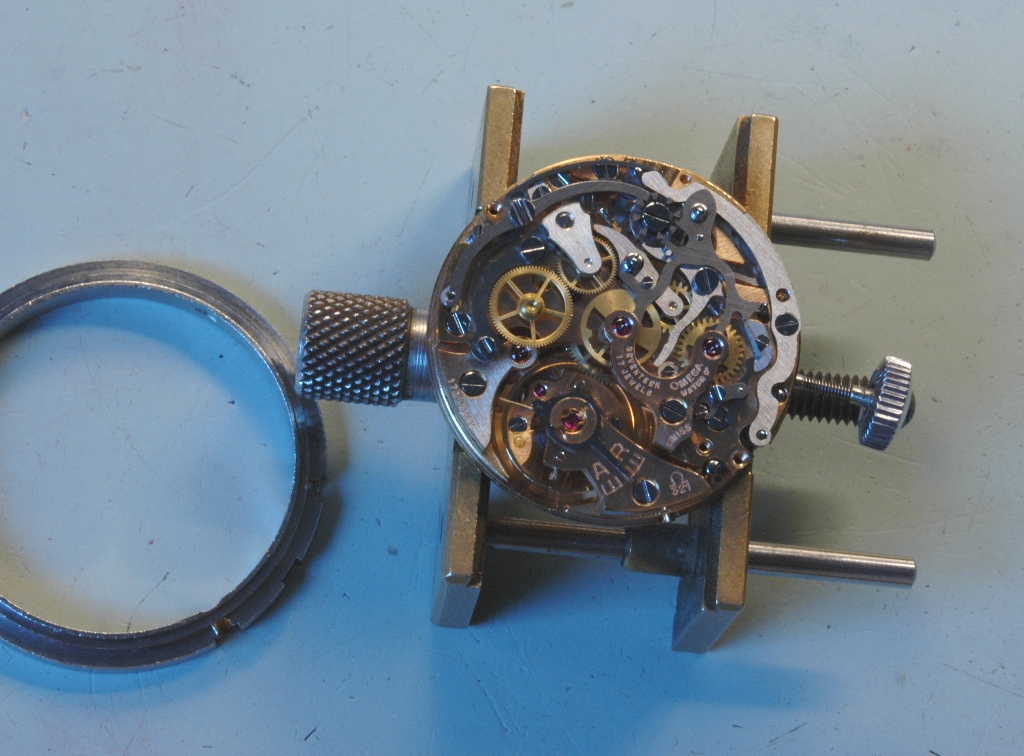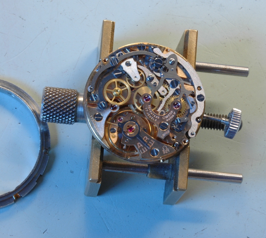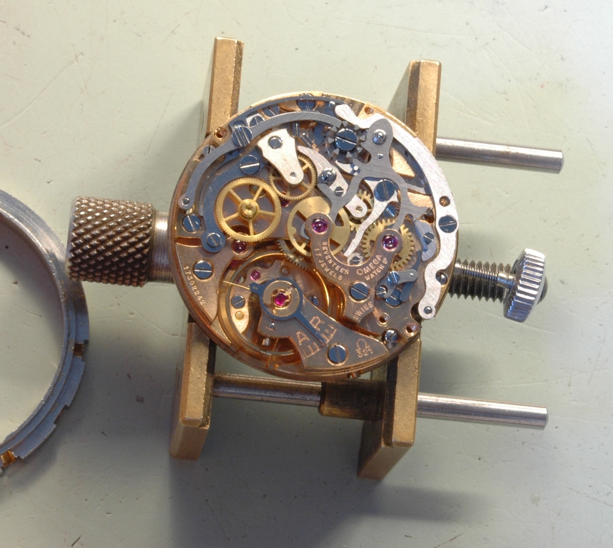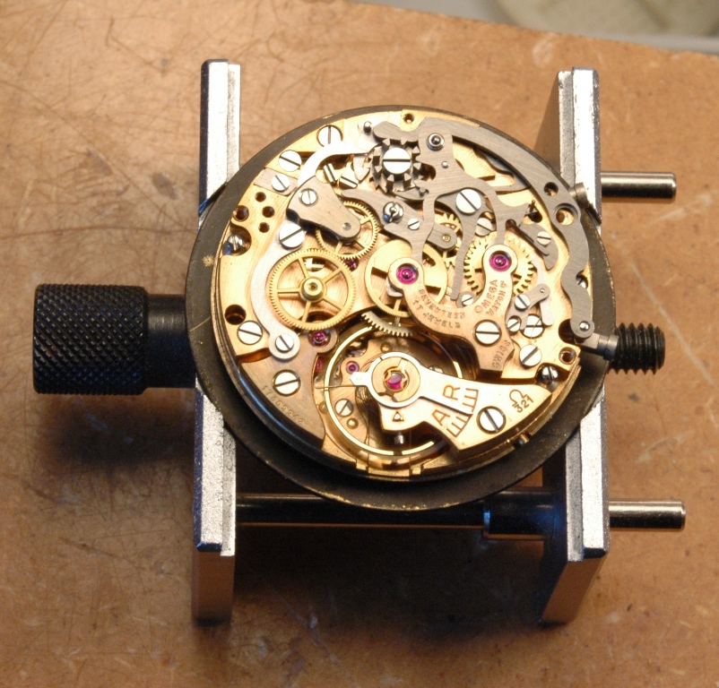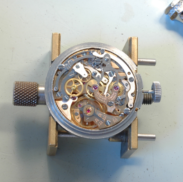 Je dépose les poussoirs, qu'il faudra aboslument conserver pour leur rareté (très souvent ces poussoirs ont été remplacés par des poussoirs plus gros lors de l'entretien au cours de la vie de la montre). Puis commençons la révision du mouvement Omega 321 équipant cette Speedmaster. Le mouvement est tout simplement magnifique.