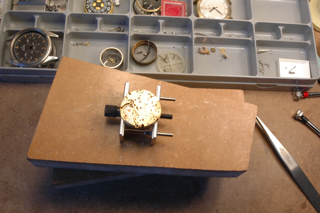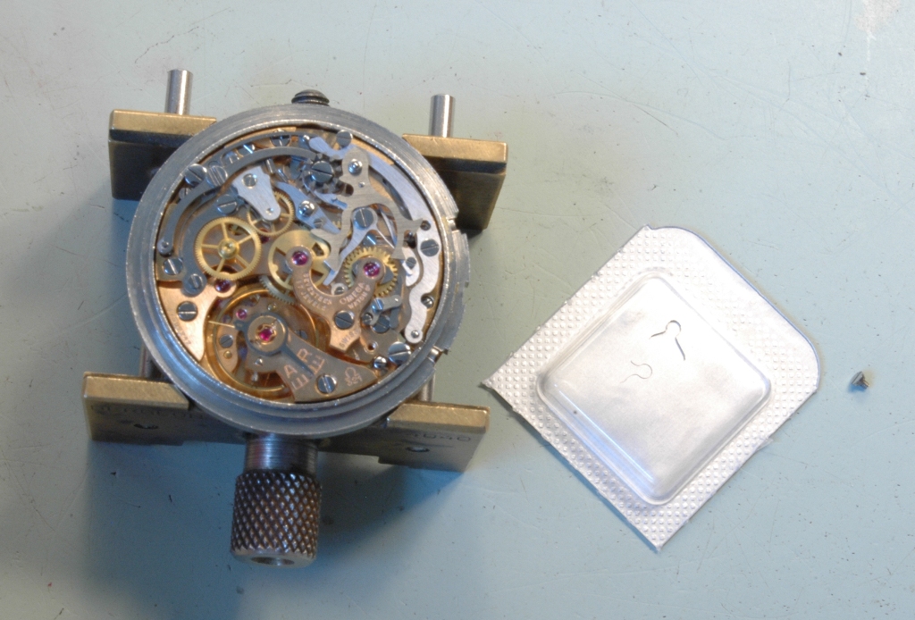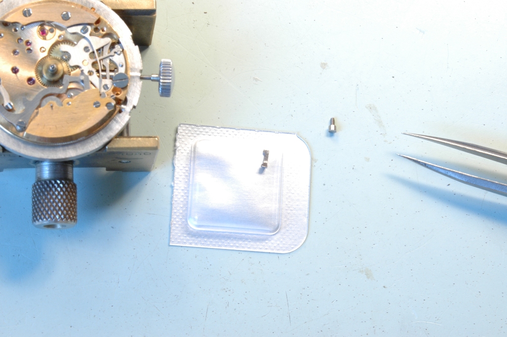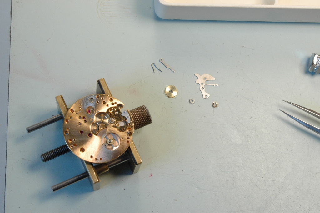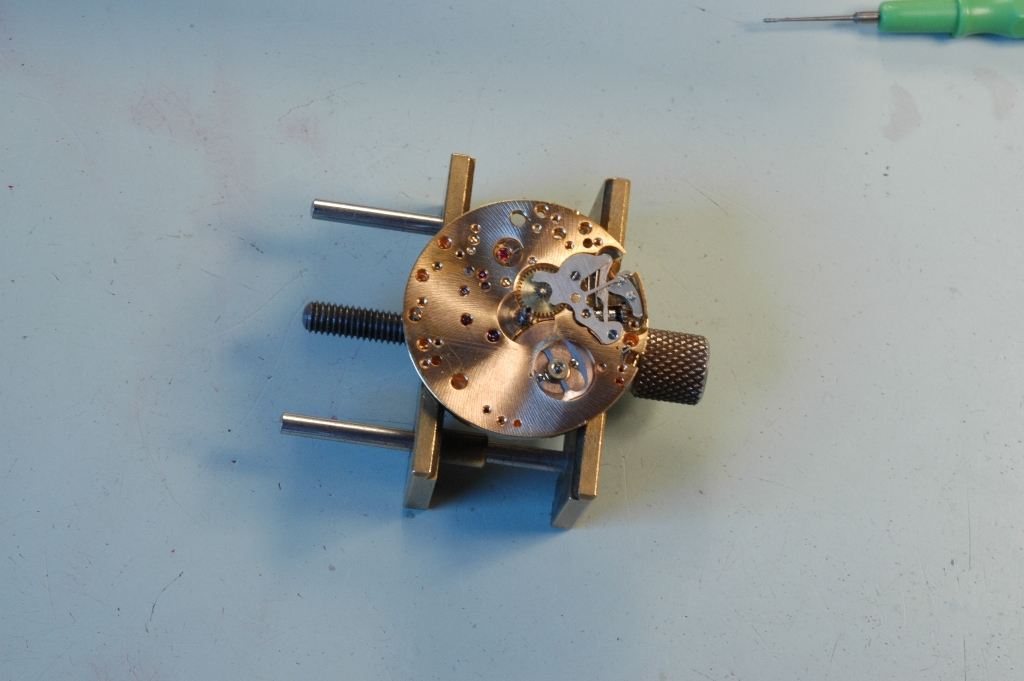 Je retourne le mouvement coté cadran et je commence à déposer les premières pièces.