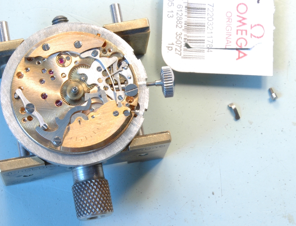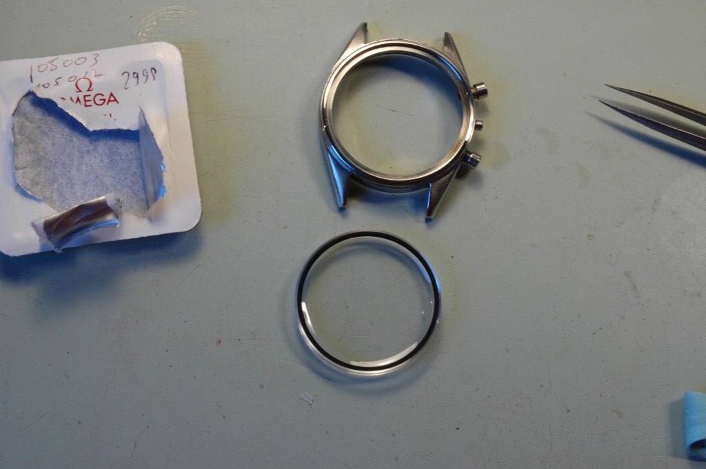Je repose le cadran et les aiguilles relumées par mes soins avec une teinte la plus proche possible de celle du cadran, puis j'emboite le mouvement avec une couronne neuve de stock Omega pour Speedmaster CK2998, et je prépare un joint de fond neuf pour l'étanchéité :