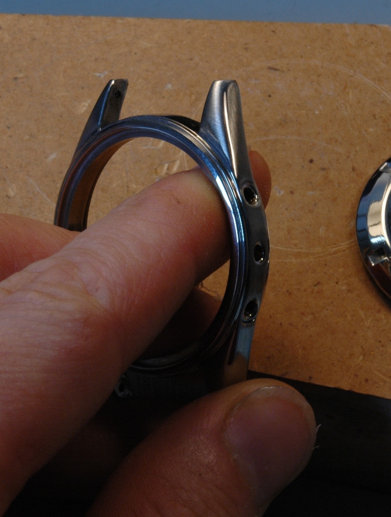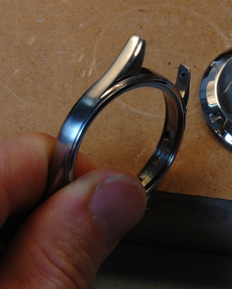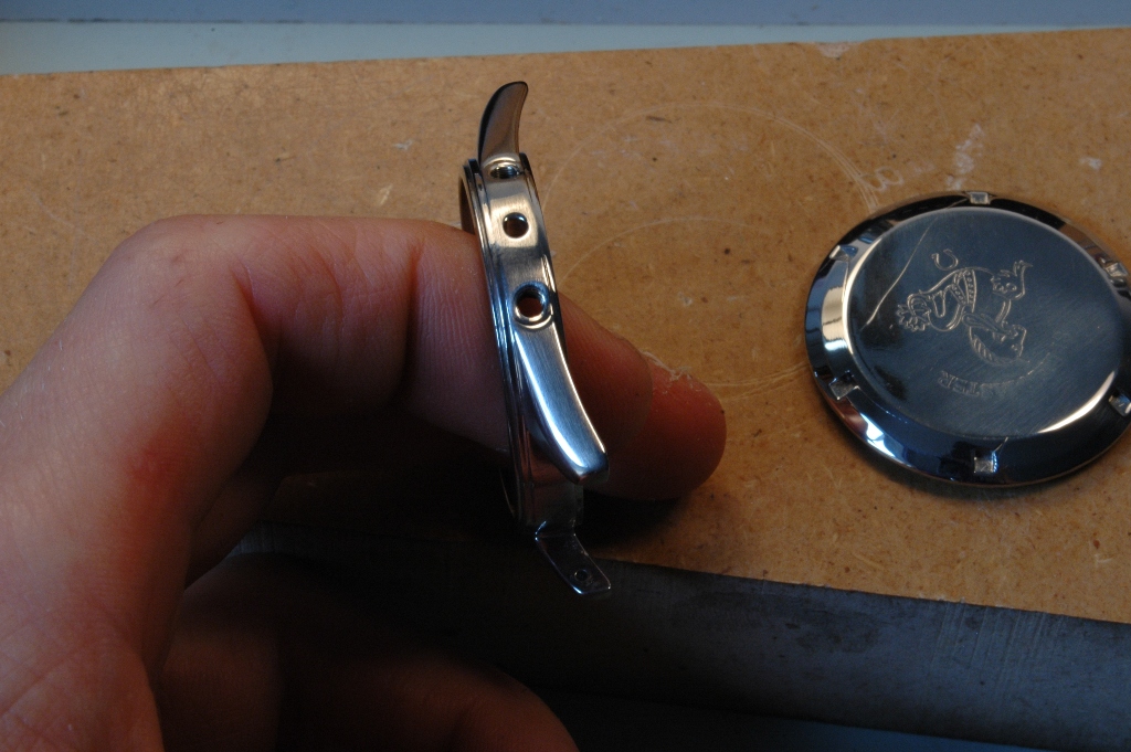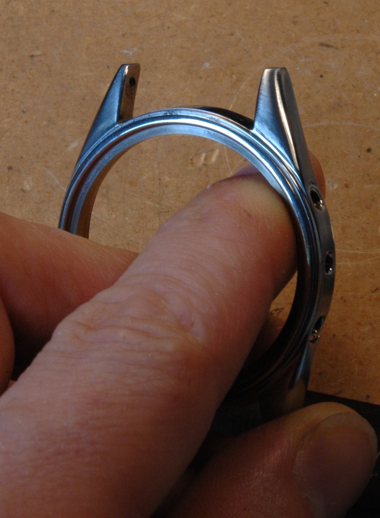 Je démarre la phase de polissage du boitier. C'est un travail très long à respirer la poussière et se bruler les mains car le boitier devient très chaud. Le résultat est à la hauteur : brossage sur les cotés et sur le dessus des anses, avec le biseau poli mirroir, dont les contours sont nets avec des arrêtes bien vives, ceci malgré les traces de chocs qui étaient présentes initialement.