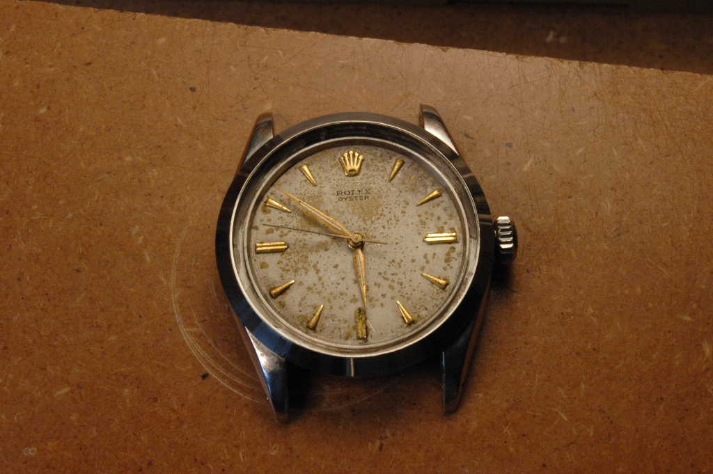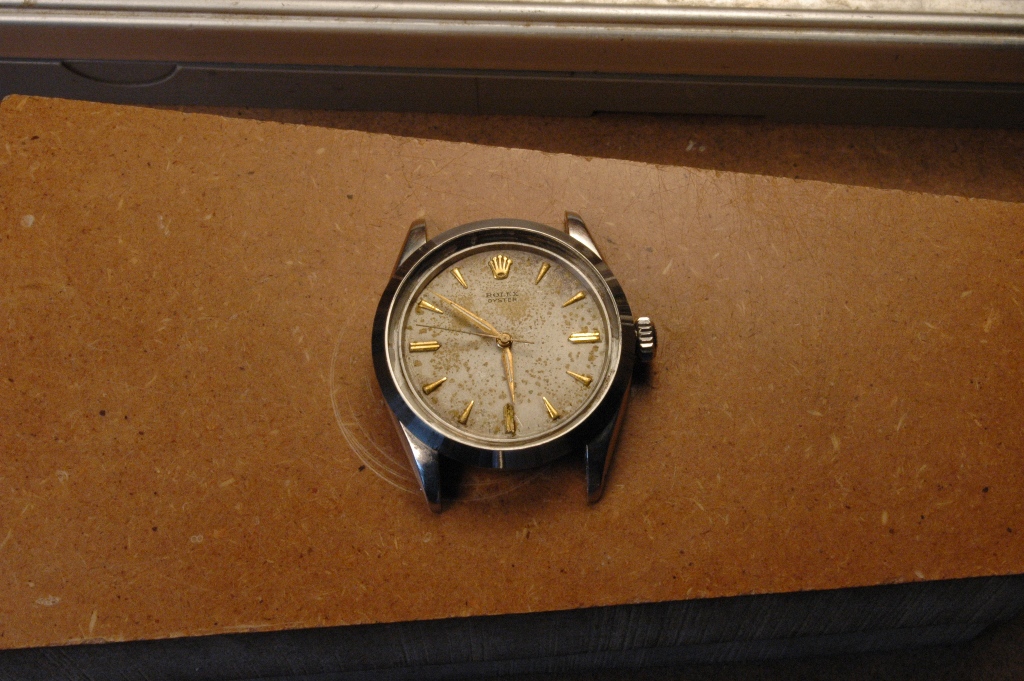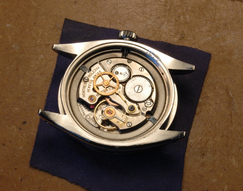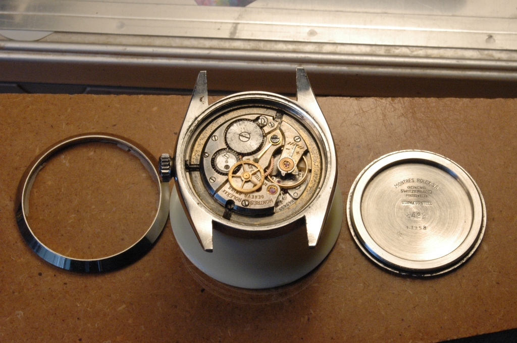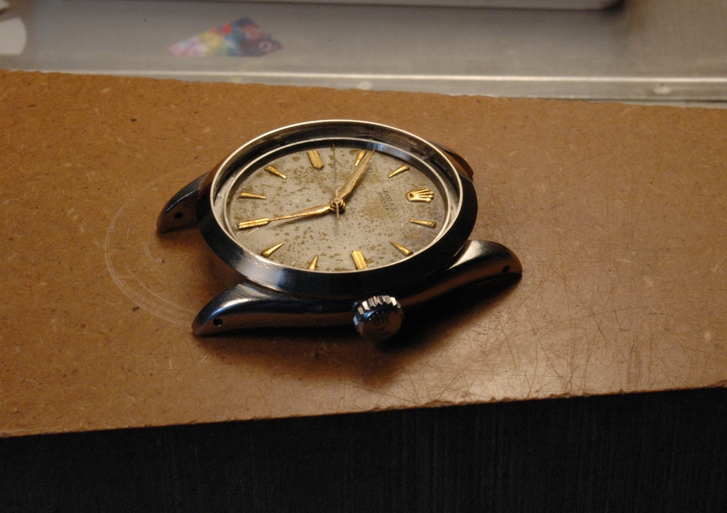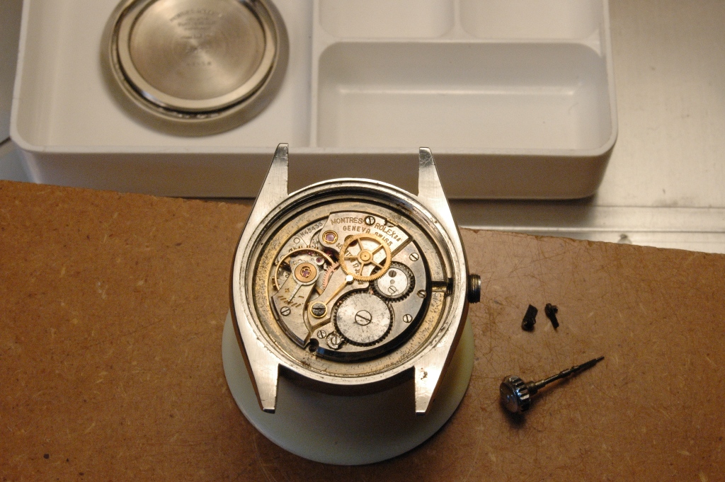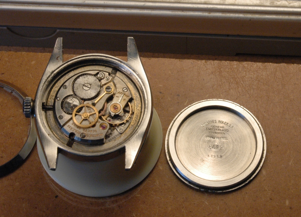 Elle présente de belles aiguilles feuille de sauge, typique des Rolex d'avant les années 60, mais le cadran est très abimé. Le verre est absent. J'ote alors la bague et je dévisse le fond :