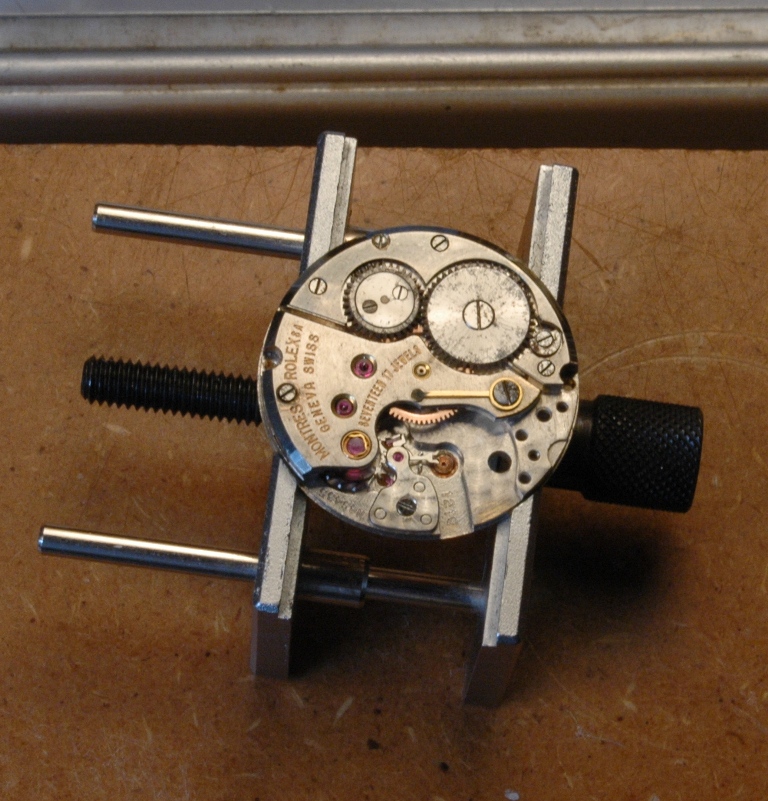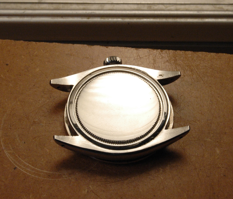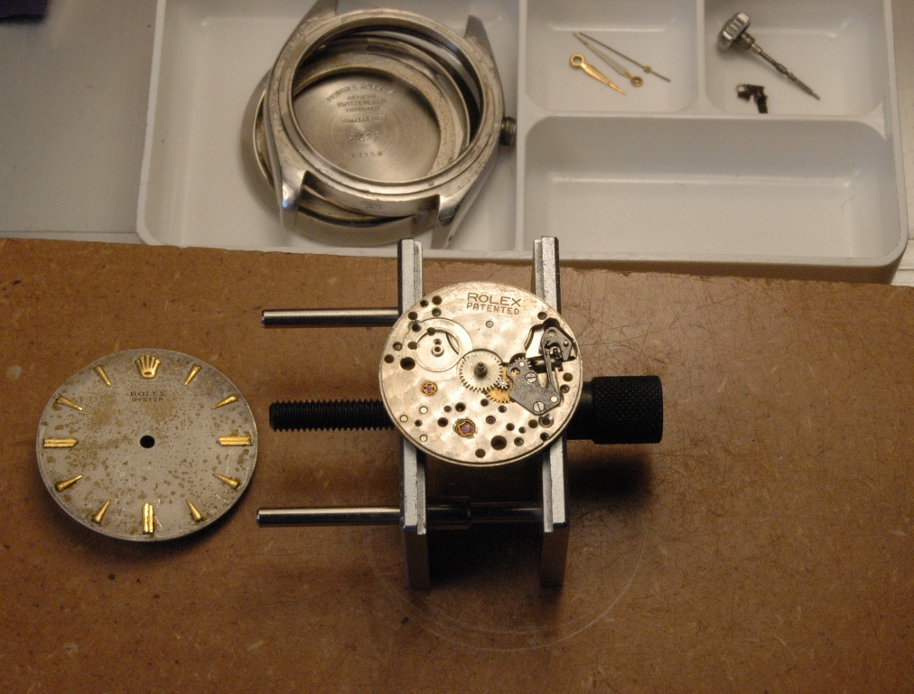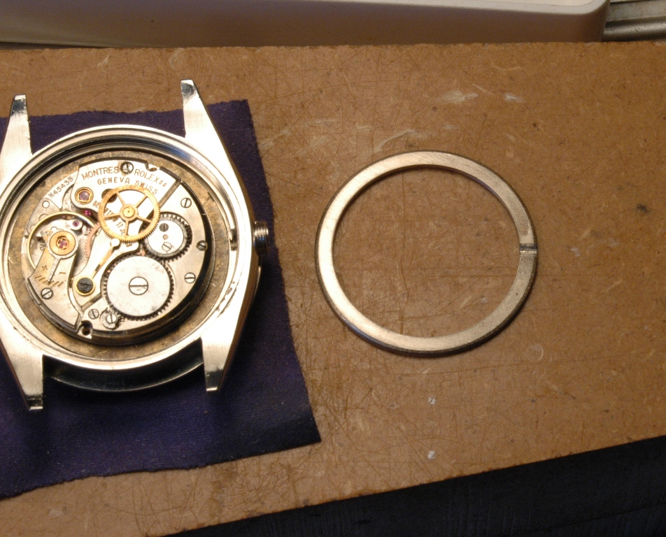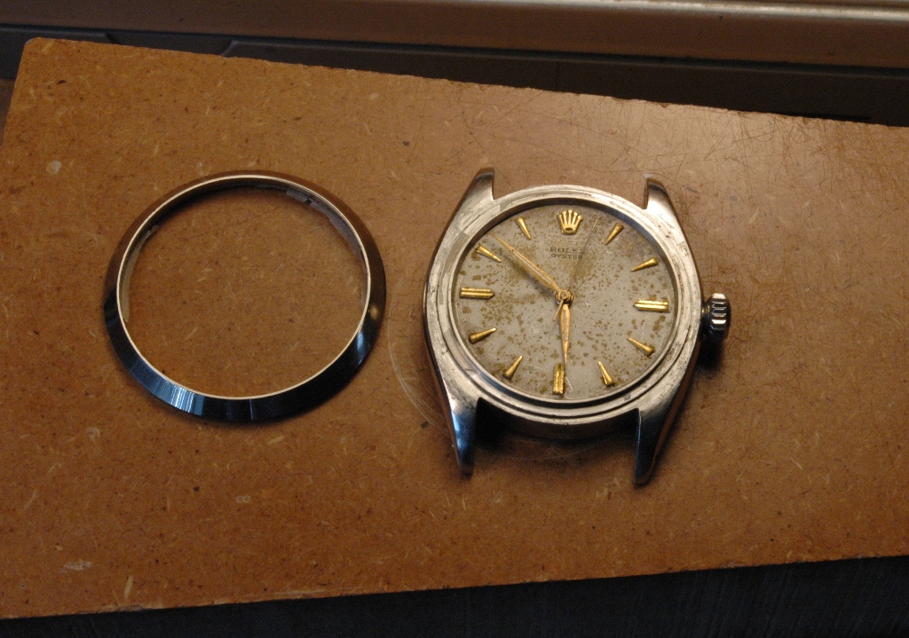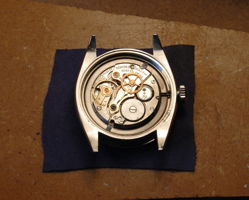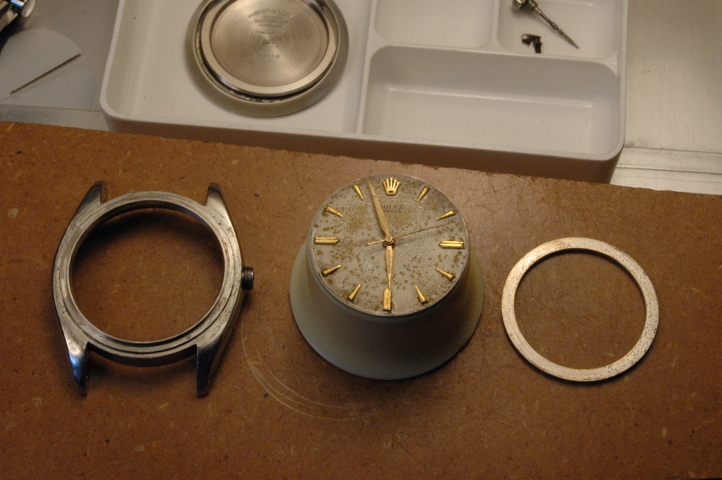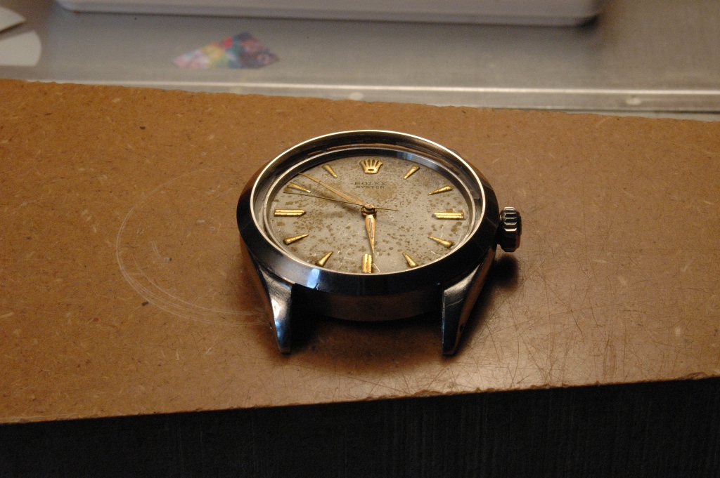 Elle présente de belles aiguilles feuille de sauge, typique des Rolex d'avant les années 60, mais le cadran est très abimé. Le verre est absent. J'ote alors la bague et je dévisse le fond :