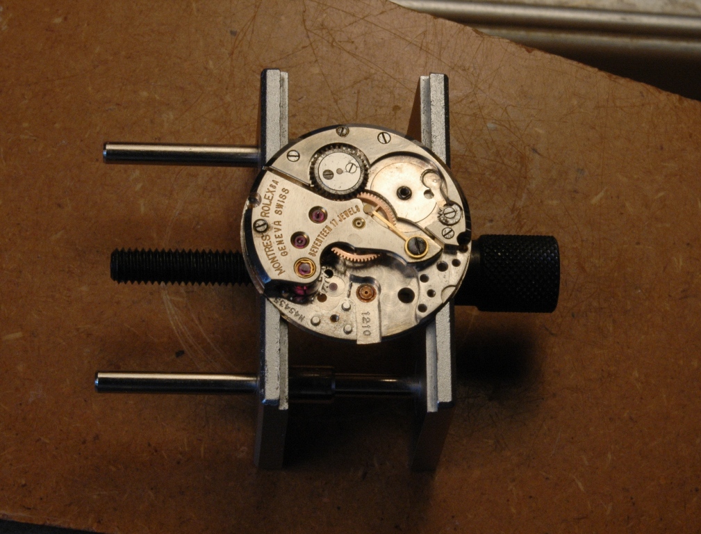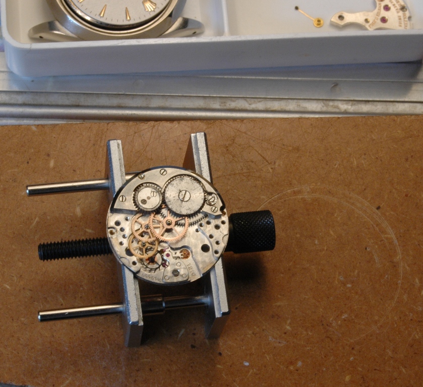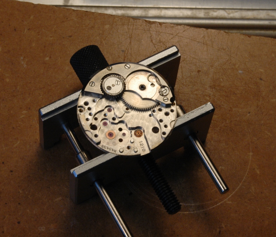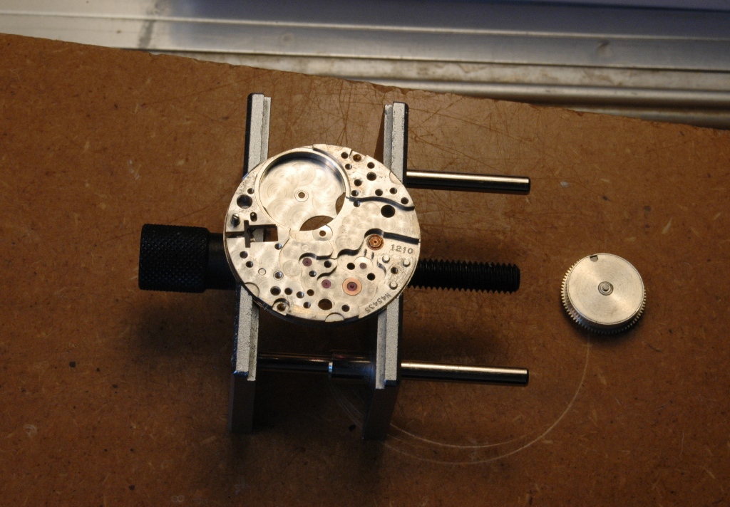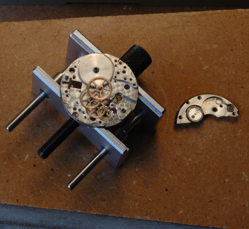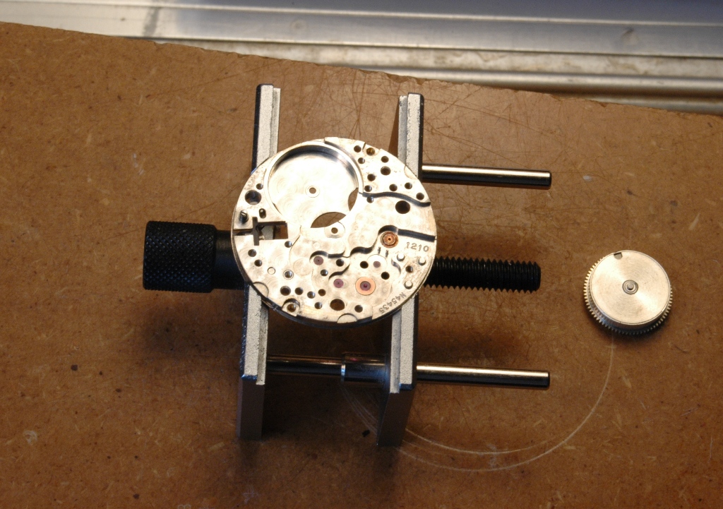 Je retourne le mouvement et je m'occupe du remontoir :