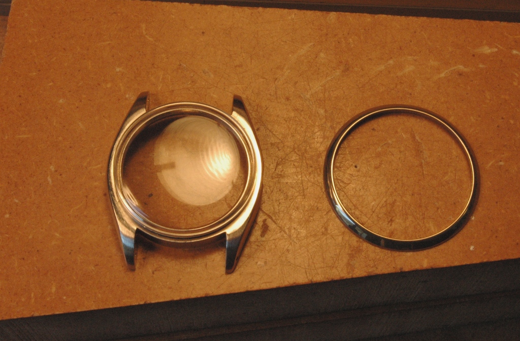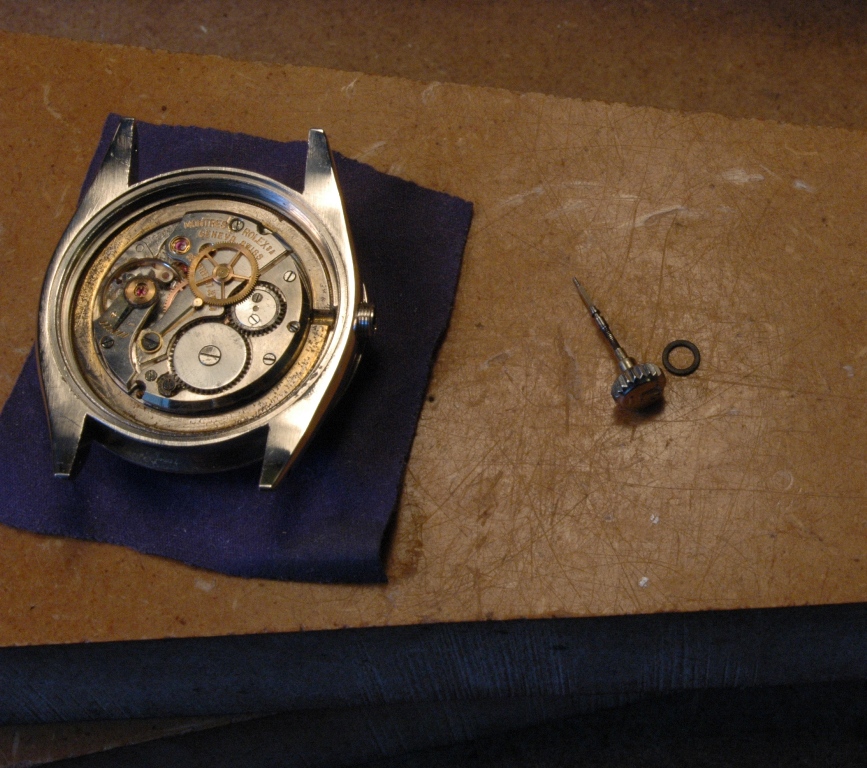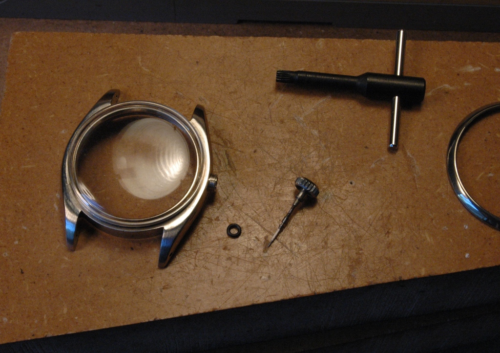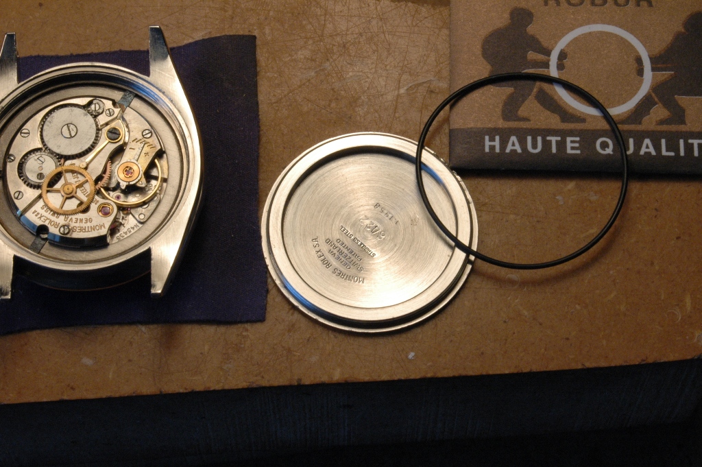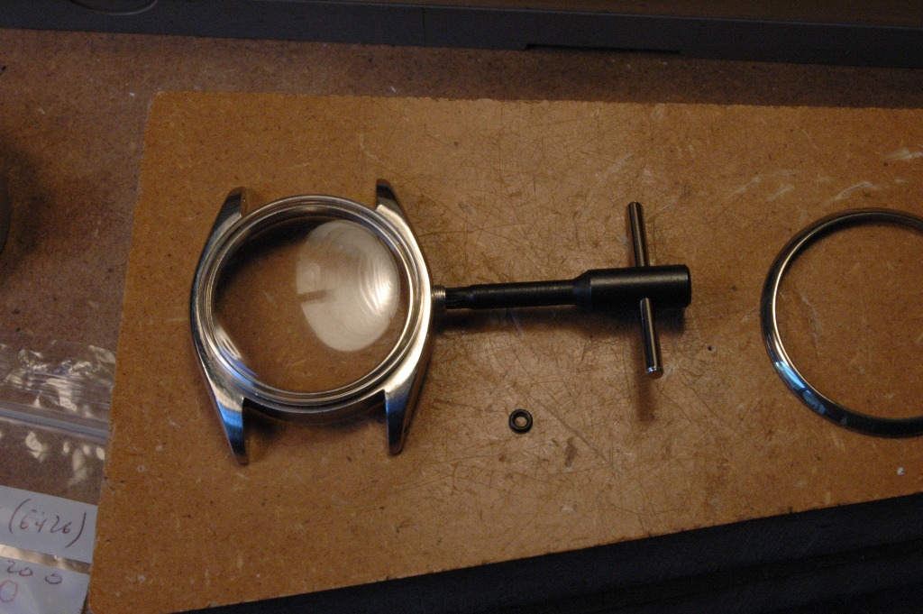 Le boitier a été repoli par mes soins, et il retrouve un verre neuf, puis je pose un tube d'étanchéité neuf, avec son joint neuf. Idem ensuite pour la couronne, avec un joint neuf également :